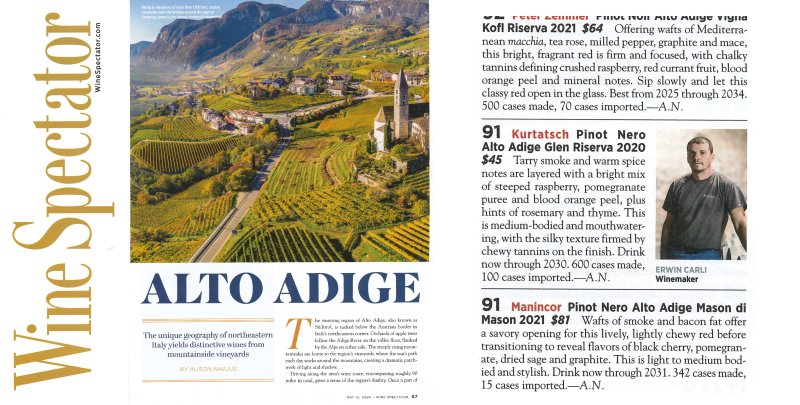 E ci sono anche buone notizie da WineSpectator, il magazine vinicolo più diffuso al mondo: oltre ai fantastici punti per i nostri vini, è stato pubblicato anche un articolo in cui il nostro villaggio Kurtatsch è finito in prima pagina, il nostro export manager Harald parla della nostra filosofia e il nostro nuovo enologo Erwin Carli è persino rappresentato con una foto! Potete vederne alcuni estratti nell'immagine soprastante.