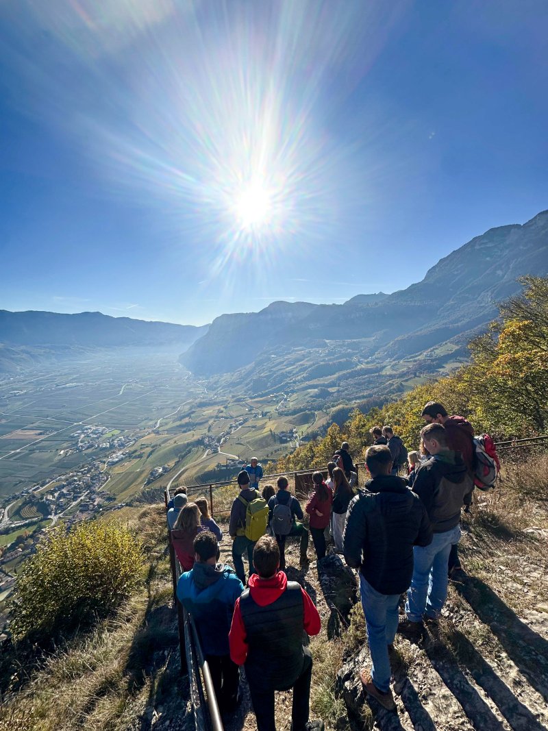 Insgesamt 45 Interessierte kamen für den gemeinsamen Nachmittag zusammen und machten sich in zwei Gruppen sogleich auf nach Graun auf 800-900 m ü.d.M. zum Aussichtspunkt "Sitzkofl". Von dort wanderten sie durch die Lagen der Kellerei, verkosteten die Weine an ihrem Usprungsort und erfuhren von Otto und Margareth, Mitgliedern des Verwaltungsrats, und unserem Obmann Andreas Interessantes über den Weinbau und über die Genossenschaft.